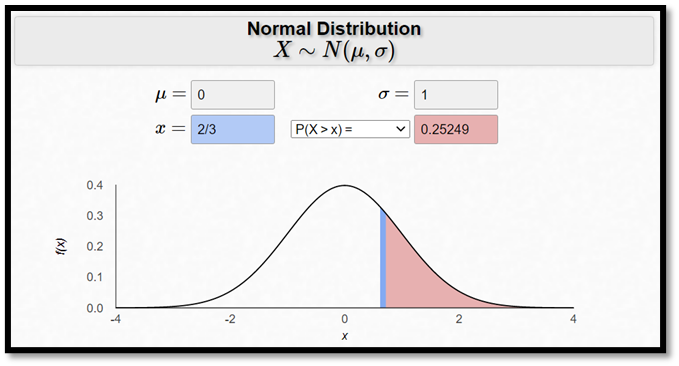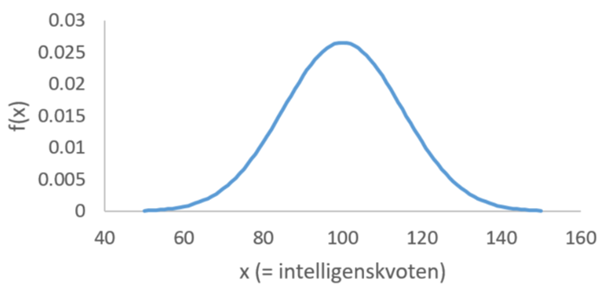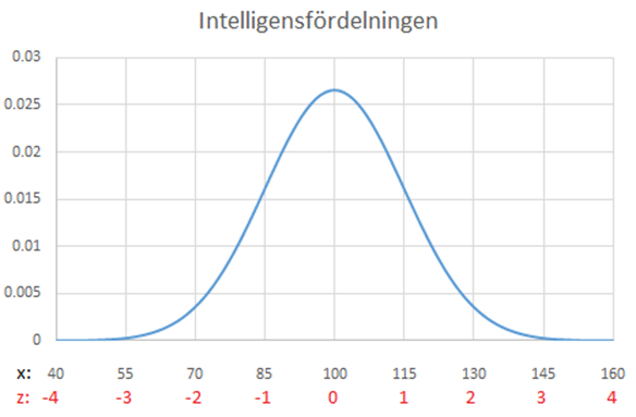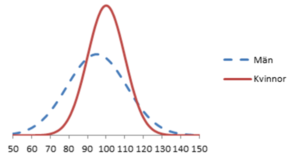- [Kräver online-kalkylator eller tabell] I vissa länder har man noterat följande paradox: Männen har i snitt sämre avgångsbetyg från gymnasiet, men ändå större chans än kvinnorna att bli antagna till de bästa utbildningarna. Hur är det möjligt? Figuren nedan ger svaret. I blått visas fördelningen för männens meritpoäng från gymnasiet och i rött visas fördelningen för kvinnornas. Båda är normalfördelade. Kvinnorna snittar 100 poäng och männen 95; kvinnornas standardavvikelse är 10 poäng och männens 16.