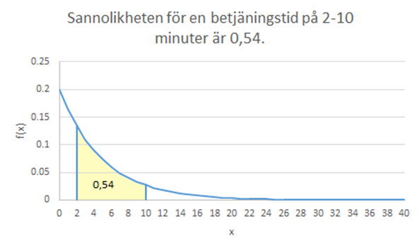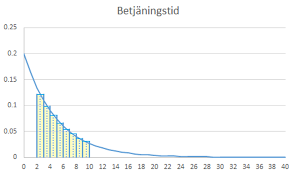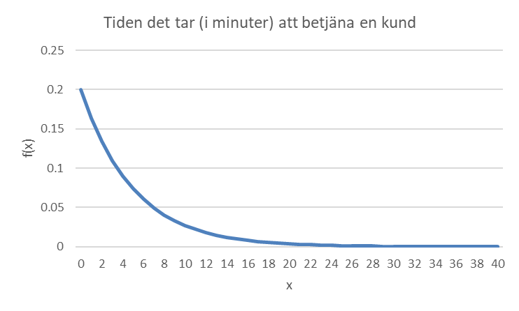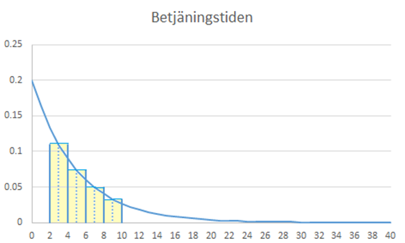 Om du tycker att detta är paradoxalt så är du inte ensam. Paradoxen ligger i att varje enskild kund ändå har en exakt betjäningstid; när nästa person blir betjänad så kommer ju något att hända, dvs. personen kommer att få en betjäningstid. Men om sannolikheten för en viss betjäningstid är noll … hur går det ihop? Paradoxens lösning ligger i att en sannolikhet på noll är inte detsamma som att ett visst utfall är omöjligt. Det här skulle stämma i en diskret värld, men inte i en kontinuerlig. (På motsvarande sätt: Om vi sätter ihop oändligt många punkter där var och en har en längd på noll, så kan dessa sammantaget ändå få en positiv längd.)↩︎