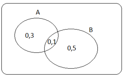 - Se venndiagrammet nedan. Sannolikheten för A är 0,3, sannolikheten för B är 0,5 och snittsannolikheten är 0,1. Hur stor är sannolikheten för att varken A eller B ska inträffa?