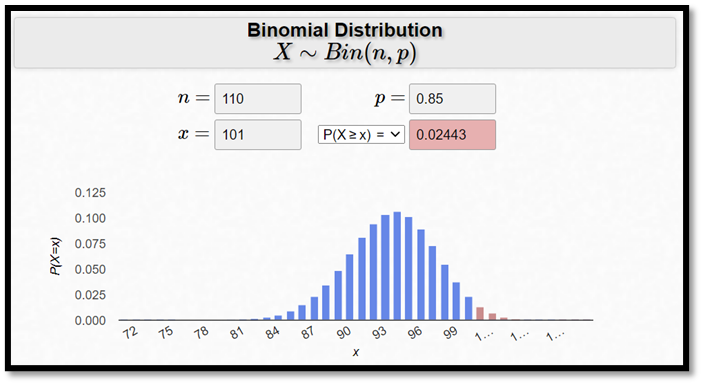 Den egentliga sannolikheten ligger alltså på 0,0176 men med hjälp av centrala gränsvärdessatsen kunde vi approximera denna sannolikhet till 0,0175.