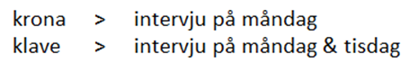 Ovanstående kallas ibland för multiplikationsregeln: Om vi har två (eller fler) oberoende händelser så får vi snittsannolikheten genom att multiplicera ihop de enskilda sannolikheterna. I exemplet ovan fick vi sannolikheten för att bli godkänd i kursen genom att multiplicera ihop sannolikheten för att bli godkänd i tentamen med sannolikheten för att bli godkänd i uppsatsen (0,8*0,8 = 0,64). Detta gäller dock inte om händelserna är beroende. Vi såg också ett exempel på detta tidigare. När sannolikheten för att bli godkänd i tentamen ökade till 95 procent givet att du blivit godkänd i uppsatsen, så fick vi snittsannolikheten genom att multiplicera denna betingade sannolikhet med sannolikheten för att bli godkänd i uppsatsen (0,95*0,8 = 0,76). Låt oss se på ytterligare ett exempel för att belysa skillnaden.